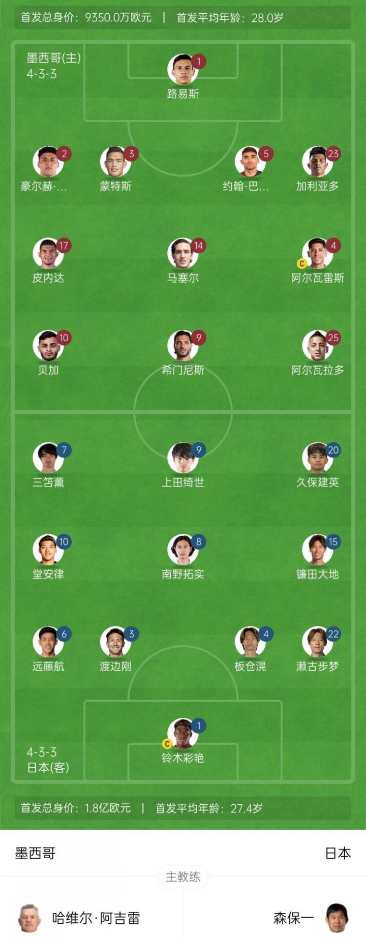 Hôm nay, Nhật Bản phải đối mặt với Mexico, xếp hạng bốn trên thế giới, và hai đội được kết hợp đồng đều và bắt tay và làm hòa. Đội Nhật đã bắt đầu tất cả những người chơi chính trong trò chơi này. Các ngôi sao của đội bao gồm Endo Kaori của Liverpool, Misaki Kaori của Brighton, Kubo Kenei của Real Sociedad, Takumi Minami của Monaco và Do'anori của Frankfurt và những người chơi nổi tiếng khác. Giá khởi điểm 180 triệu euro là gấp đôi so với Mexico.