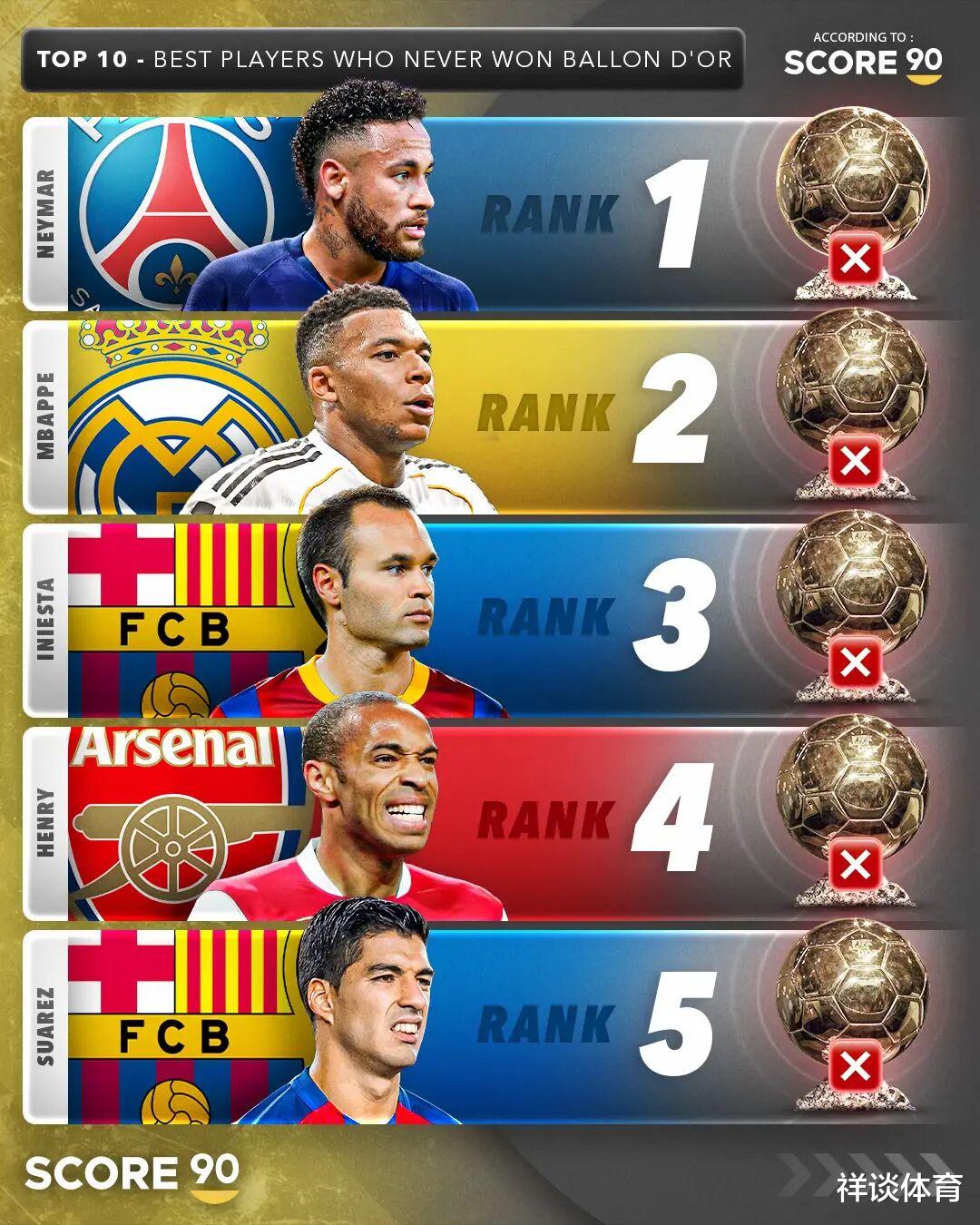 Nhưng sau tất cả, Arsenal chưa bao giờ giành được Champions League. Vào thời điểm anh giành được Champions League tại Barcelona, Henry không còn là cầu thủ đầu tiên trong đội. Vì vậy, các ngôi sao Pháp cũng bỏ lỡ Quả cầu vàng. Xếp thứ năm là Suarez. Suarez có thể giật hai đôi giày vàng châu Âu từ Messi và Ronaldo ở đỉnh cao của anh ta, điều này đã chứng minh sức mạnh của anh ta. Tuy nhiên, nó vẫn là một vấn đề cũ. Tiền đạo ở cùng thời đại với Messi và Ronaldo được định sẵn sẽ bỏ lỡ Quả cầu vàng.