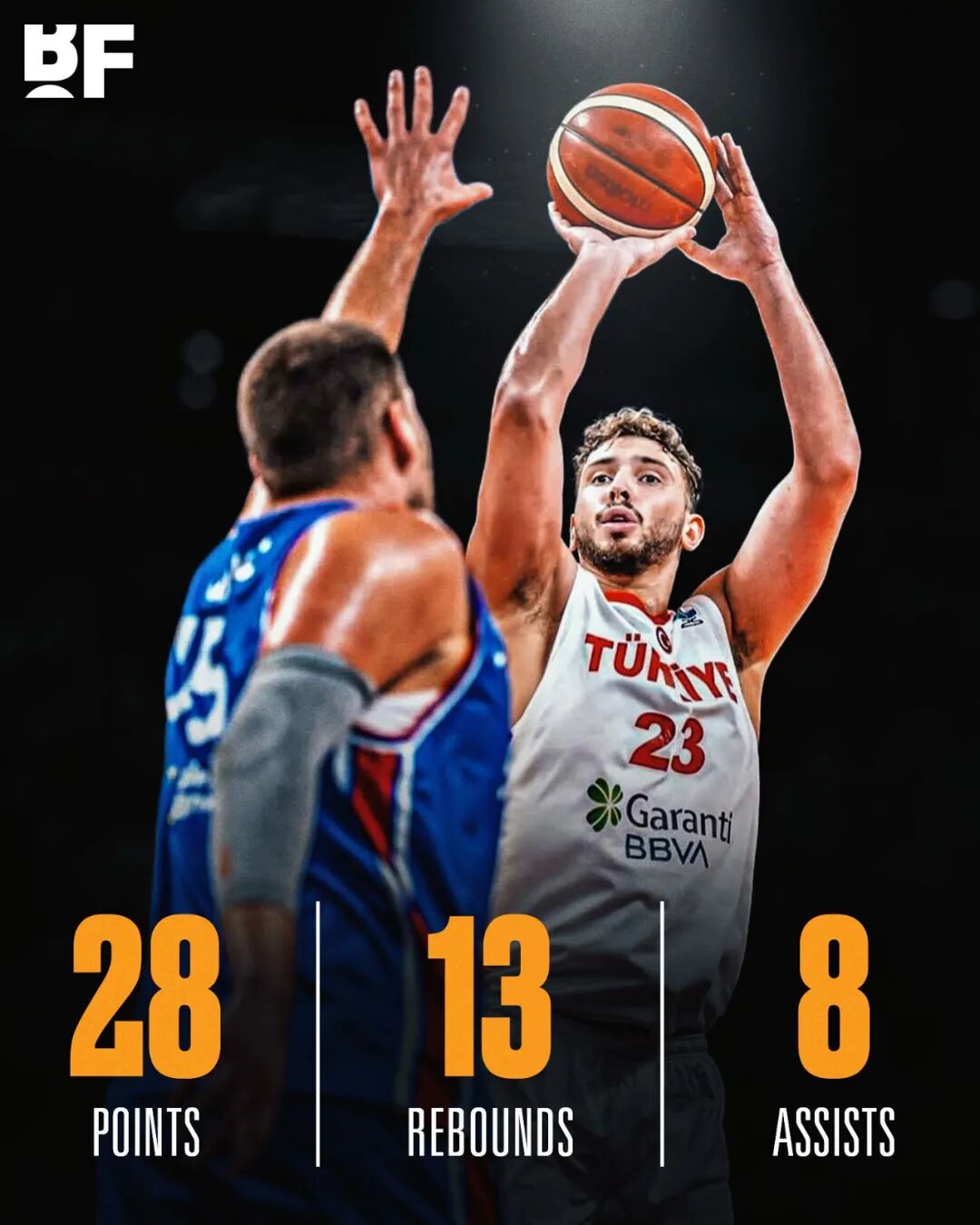 -Against Bồ Đào Nha, 9 trong số 13 phát, ghi được 20 điểm, 7 rebound, 5 hỗ trợ