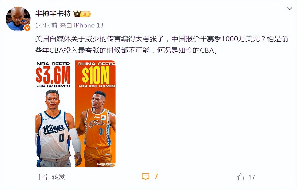 Vào ngày 15 tháng 10, Westbrook 36 tuổi vẫn chưa tìm được việc làm ở NBA. Gần đây, giới truyền thông Mỹ liên tục rộ lên tin đồn về những lời đề nghị CBA dành cho Westbrook, đặc biệt là tin đồn đưa ra lời đề nghị từ 10 triệu đến 14 triệu USD cho Westbrook trong nửa mùa giải. Giờ đây, trước những tin đồn quá đáng như vậy, các nhân vật truyền thông trong nước như Á thần Carter đã tức giận chỉ trích sự bịa đặt này là quá cường điệu.